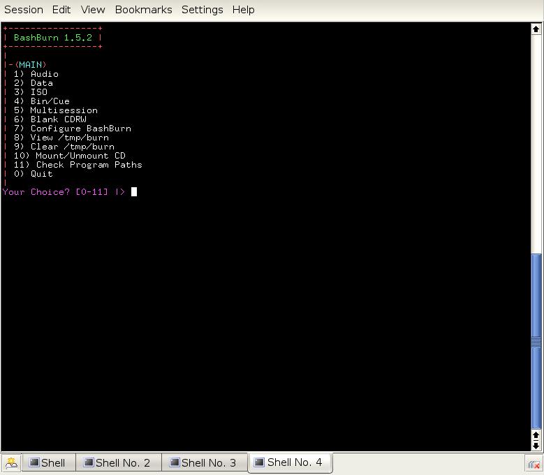 Nach der Installation wird das Programm durch den Aufruf bashburn gestartet und man erhält ein kleines Menu
