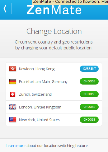 Was ist ZenMate? Auf der Webseite verspricht die Anwendung Verschlüsselung sowie anonymes Browsen. Der Internetverkehr wird durch virtuelle private Netze (VPNs) geleitet. Das Plugin lässt sich einfach installieren und fragt anschliessend nach einer E-Mail-Adresse. Nachdem eine E-Mail-Adresse eingegeben wurde, wird das Plugin nach einer kleinen Wartezeit aktiv. In der Browserleiste im Firefox erscheint ein grünes Schild und nach einem Klick lässt sich rechts unten der Ort wechseln (Change Location). Auf Empfehlung des Teilnehmers wählten wir im Kurs Hong-Kong aus und fühlten uns geschützt. Doch wie sieht die Realität aus?